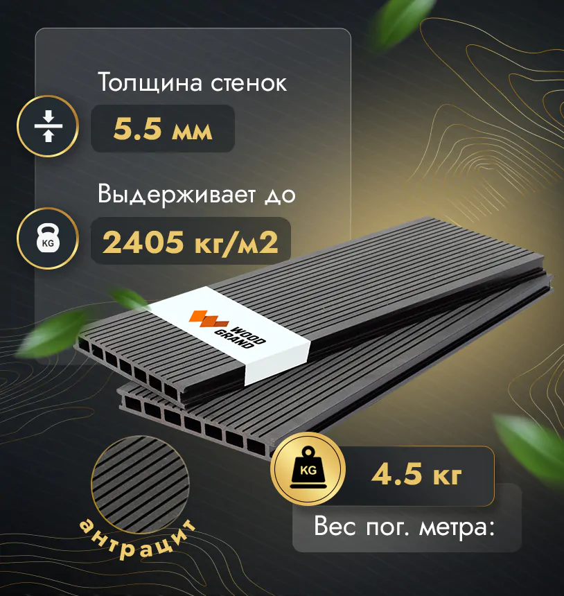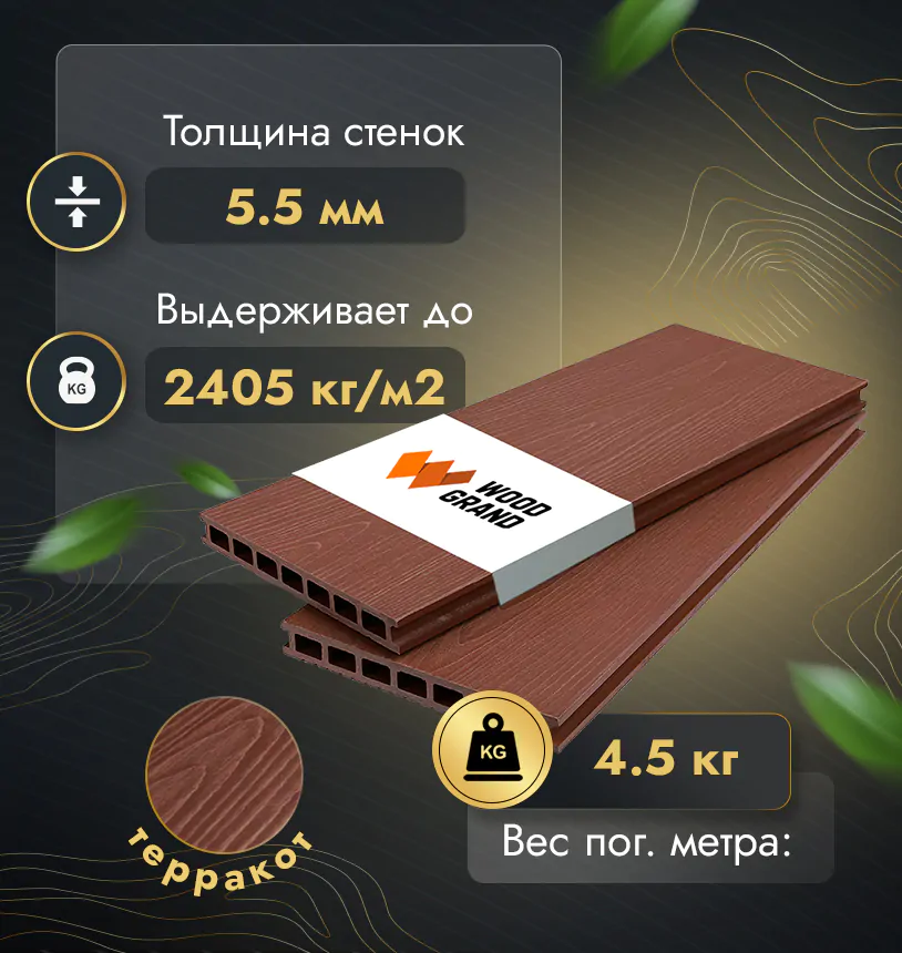 Наша террасная доска из МПК выдерживает до 3318 кг/м2, влагостойкая, не требует ухода.